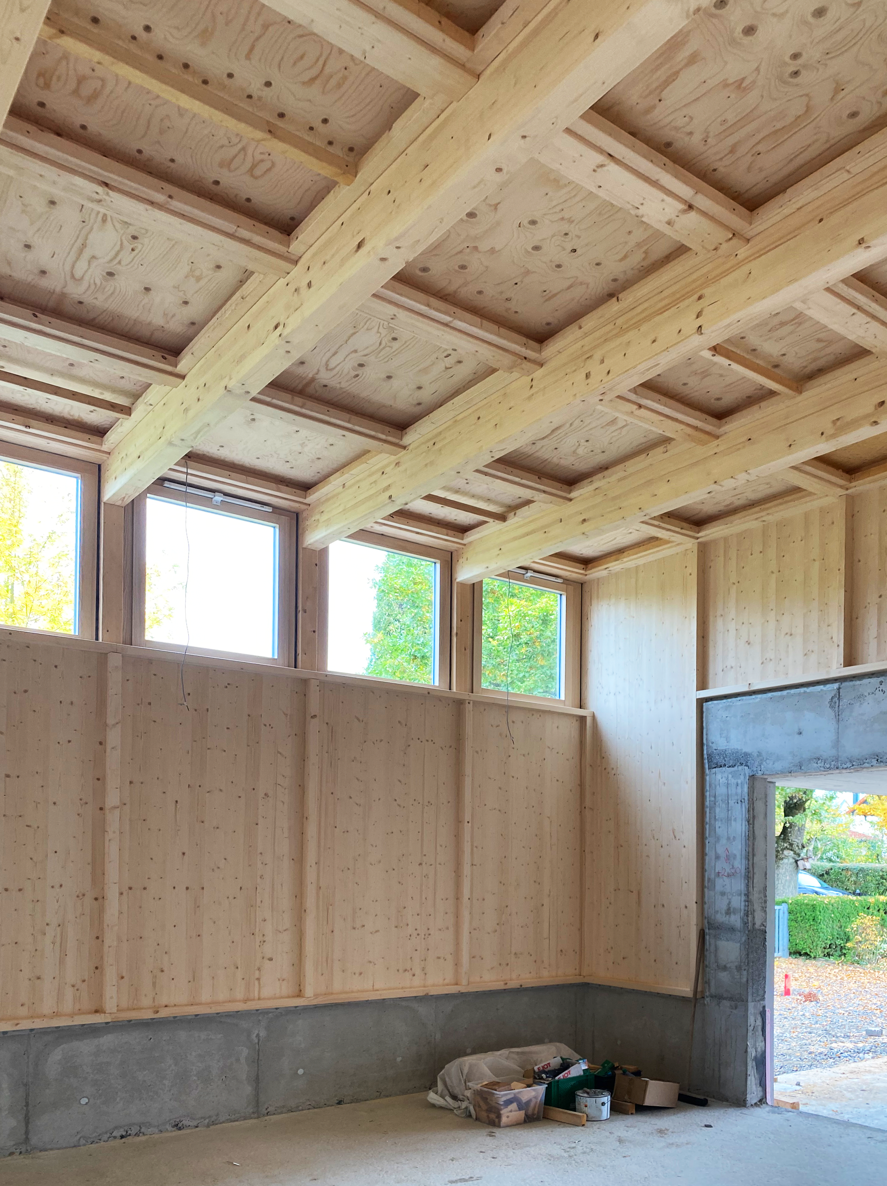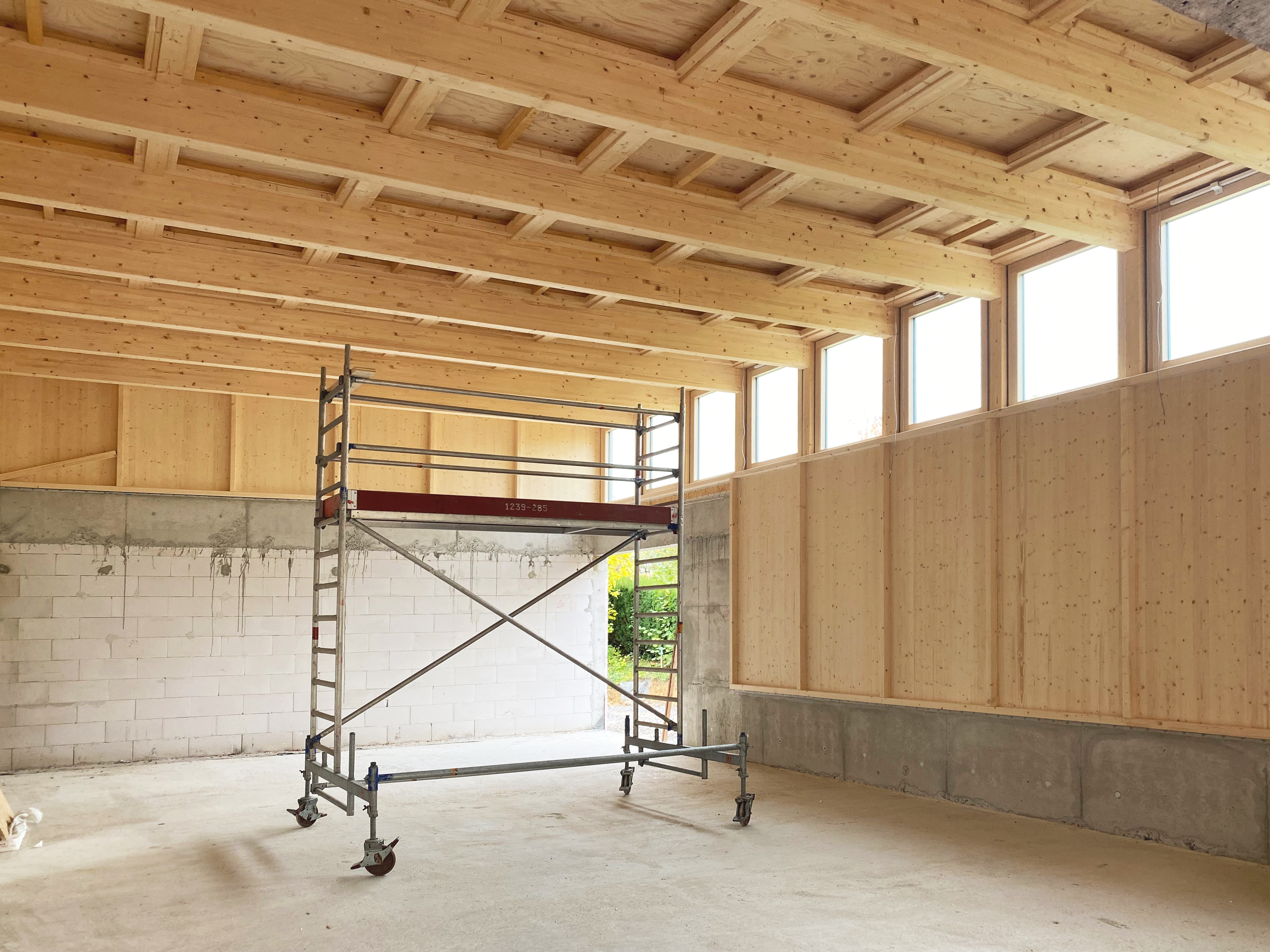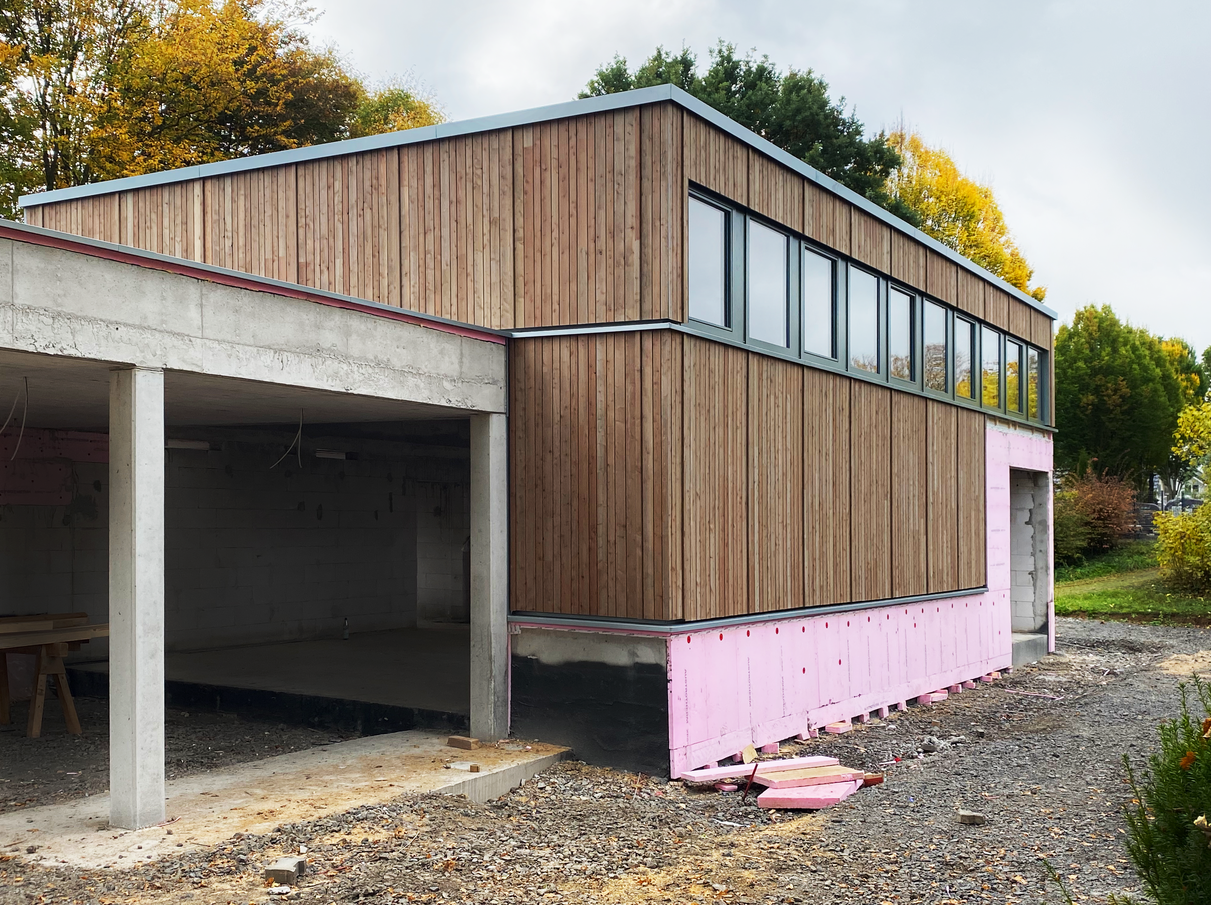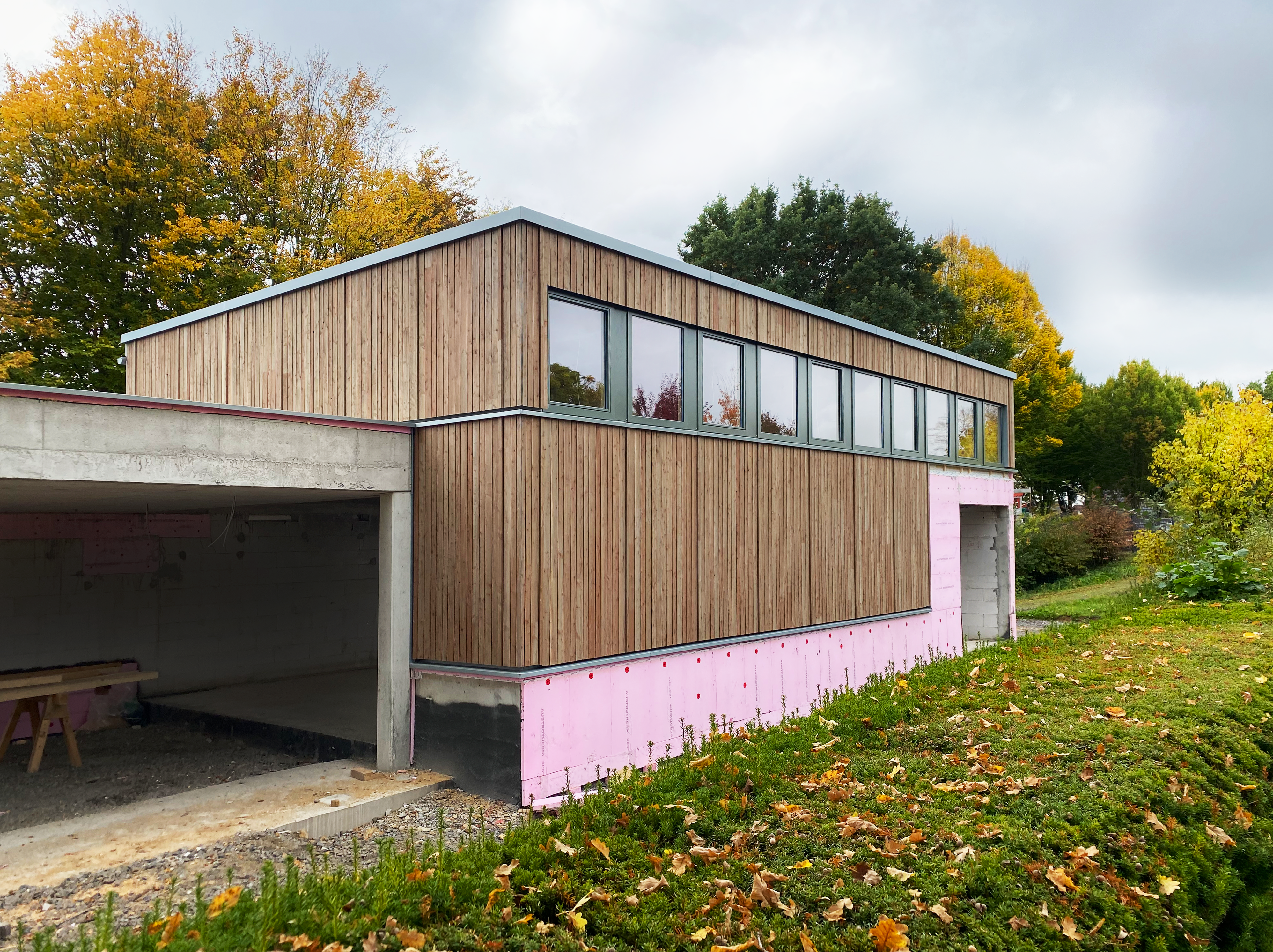 Das Gebäude wurde in Hybridbauweise (Holz-Massiv-Mischkonstruktion