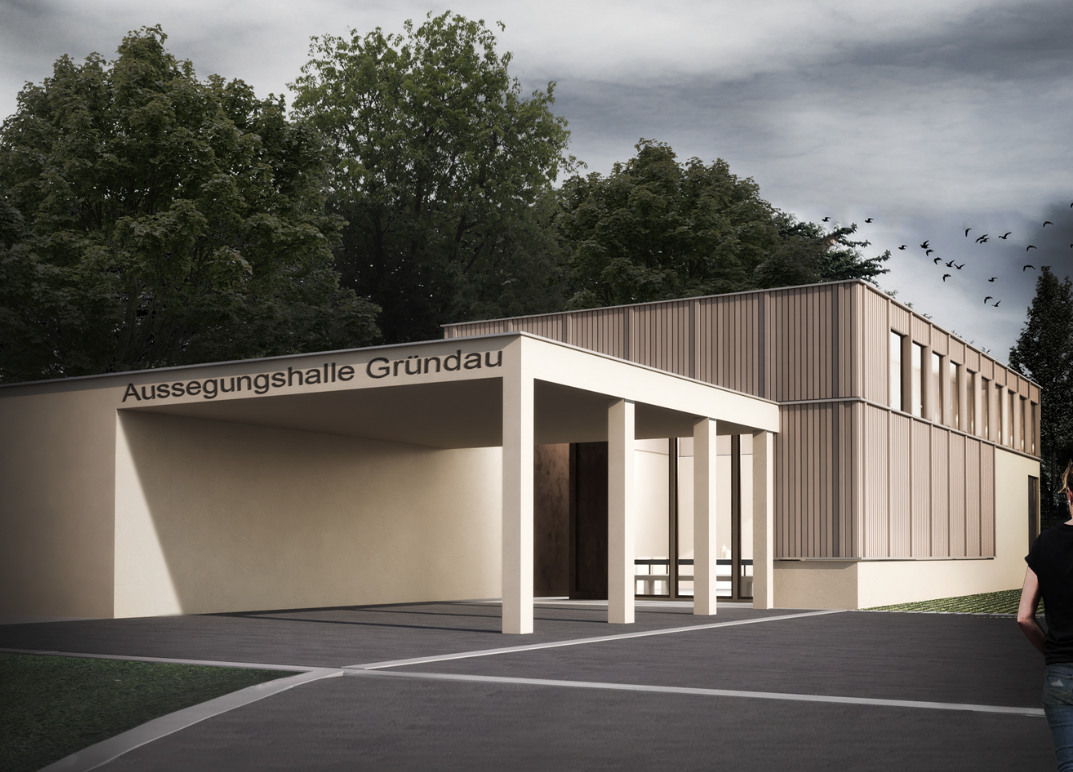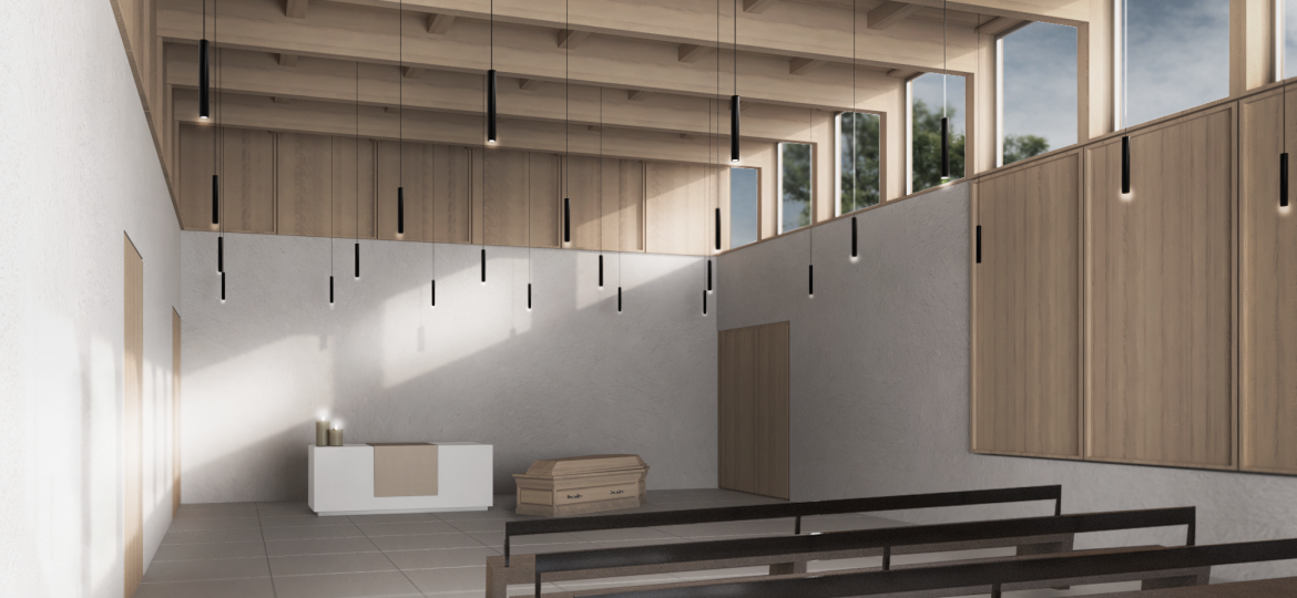 Der Innenraum ist auf das Innere, das Zeremonielle konzentriert und ermöglicht Trauernden somit Privatsphäre. Oberlichter in der Holzfassade lassen dennoch atmosphärisches Tageslicht zu. Die Putzfassade im Zusammenspiel mit einer unregelmäßigen vertikalen Holzlamellenfassade agieren harmonisch miteinander und erzeugen je nach Sonnenstand ein unterschiedliches Lichtspiel.